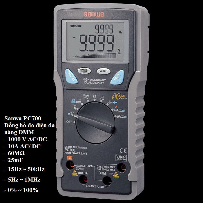 | Đo điện áp xoay chiều AC | 60m/600m/9.999/99.99/999.9V | ±(0.5%+3) |